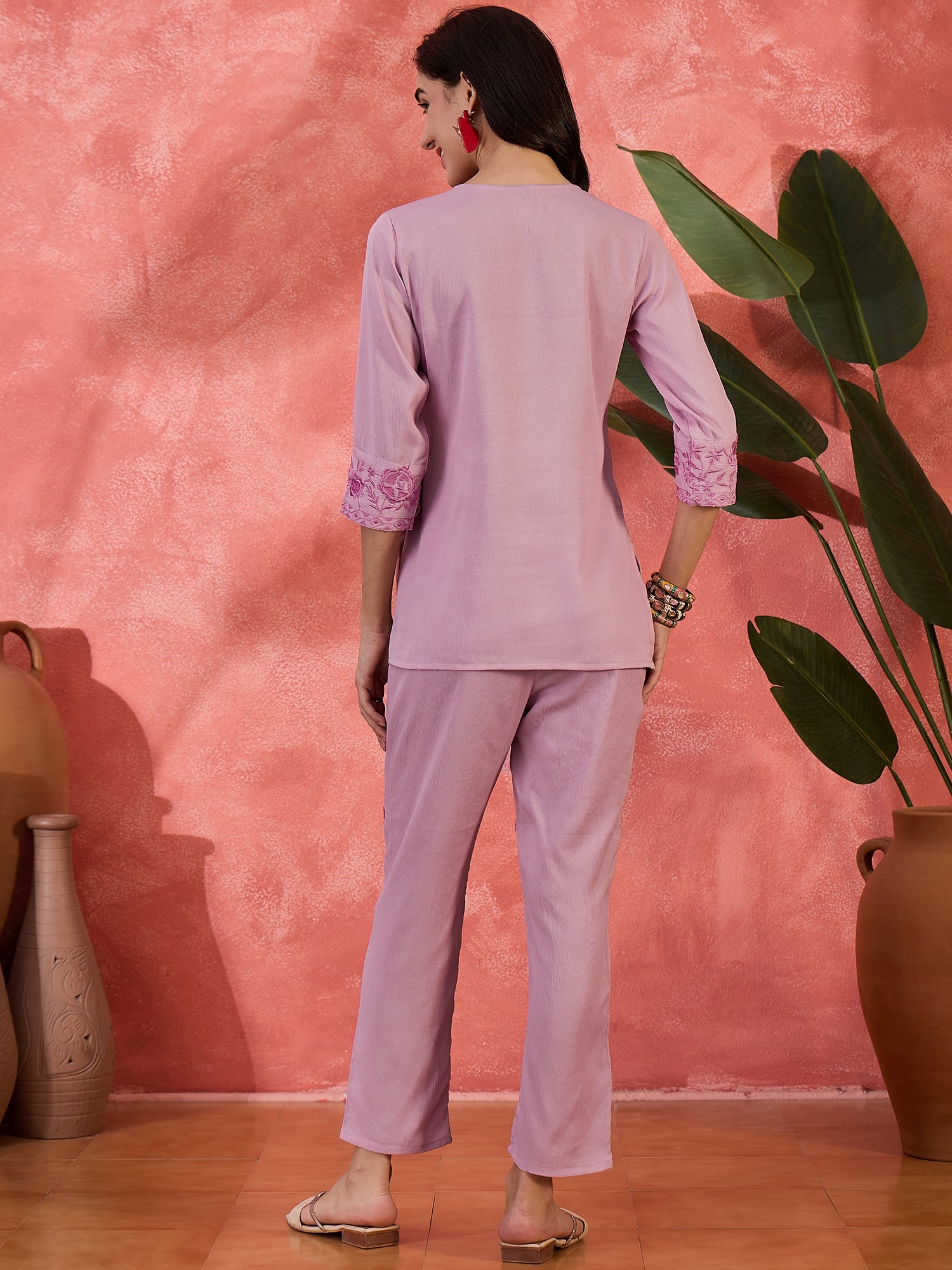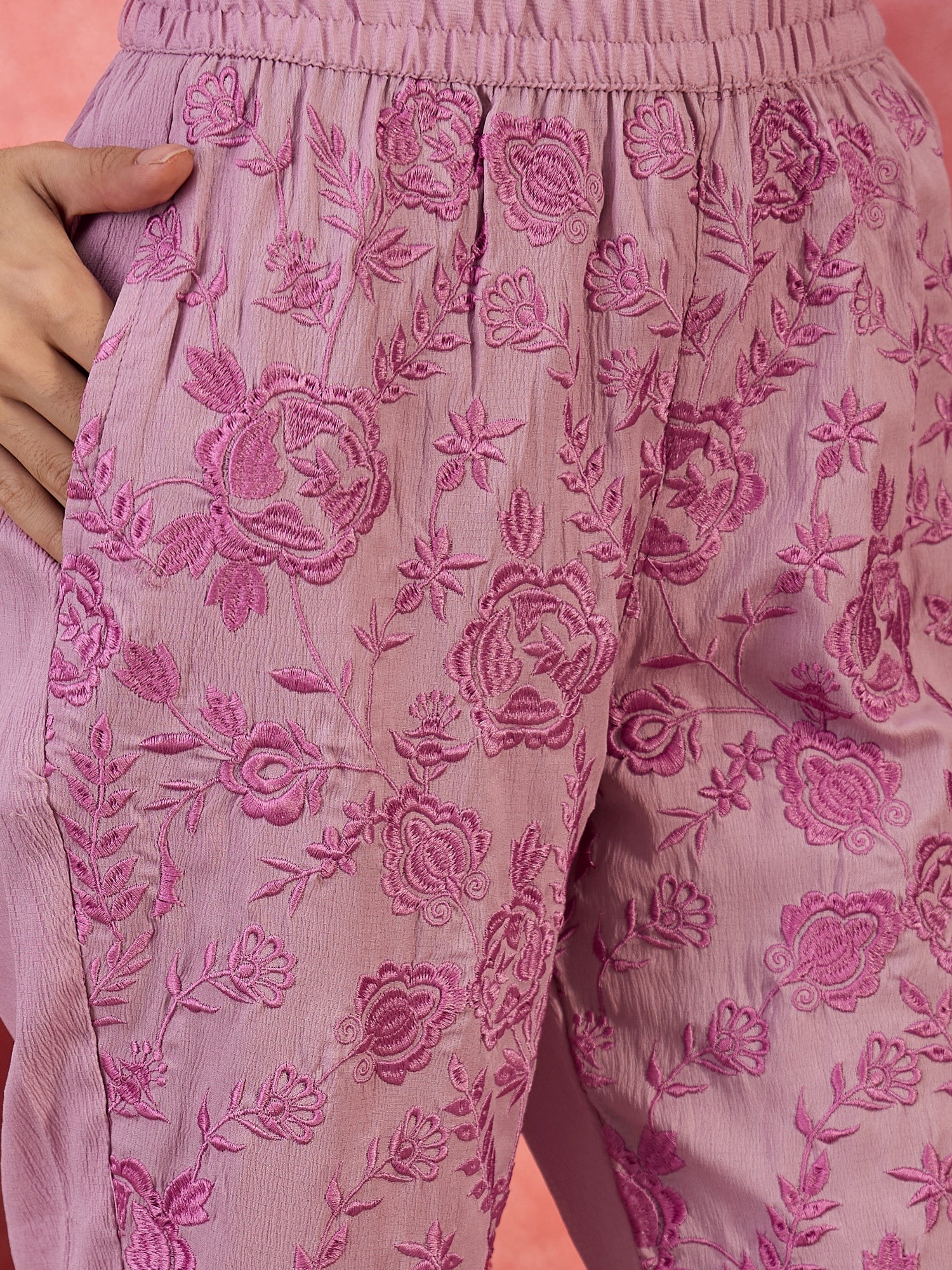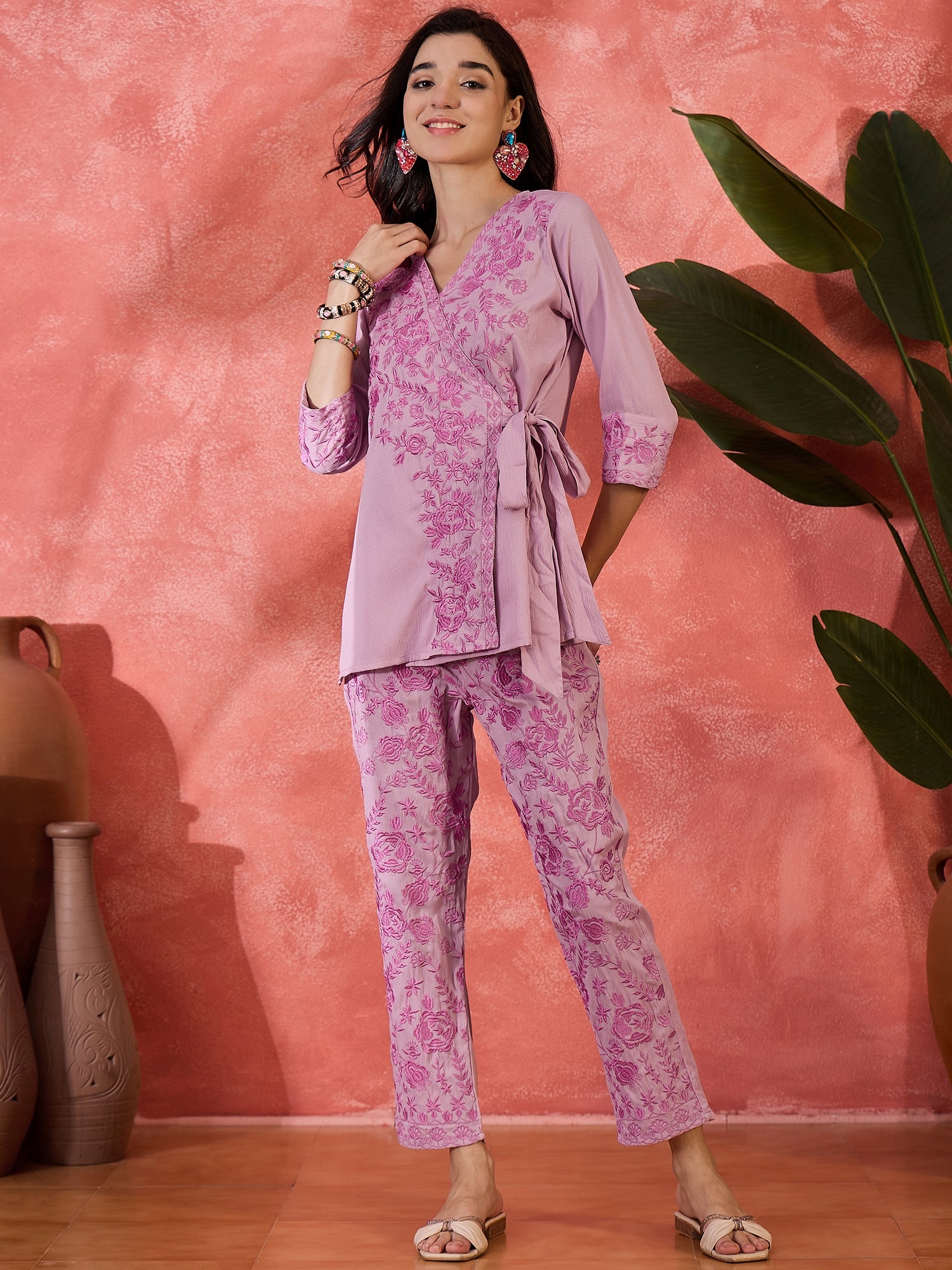 Serene Poise Floral Embroidered Overlapping Tie-Up Top & Trouser Co-Ord Set