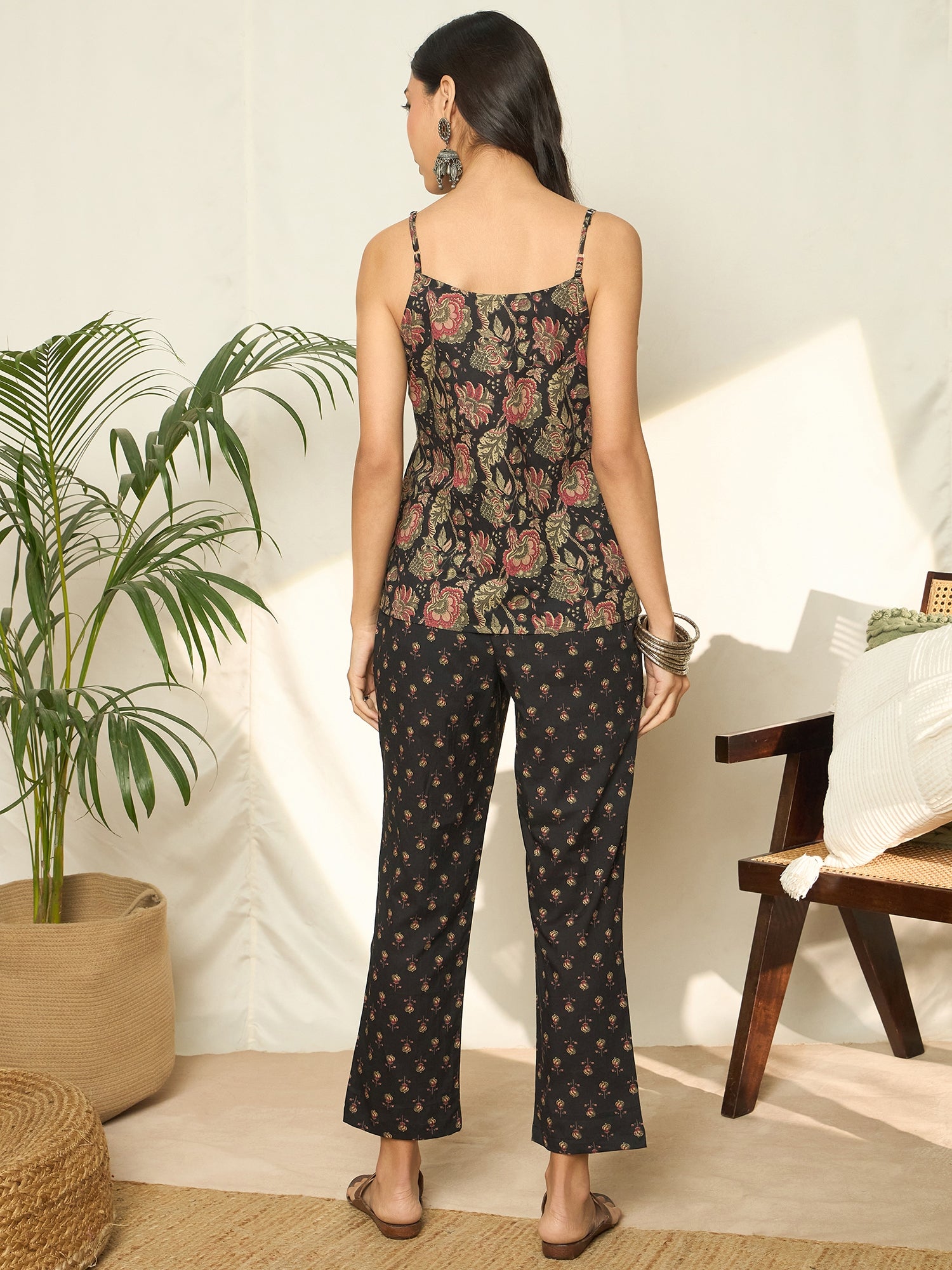 Gulzar celebrates blooming elegance — a pure cotton co-ord set featuring a floral-printed top and trousers, layered with a matching shrug. Light, graceful, and versatile — perfect for relaxed days or chic getaways.