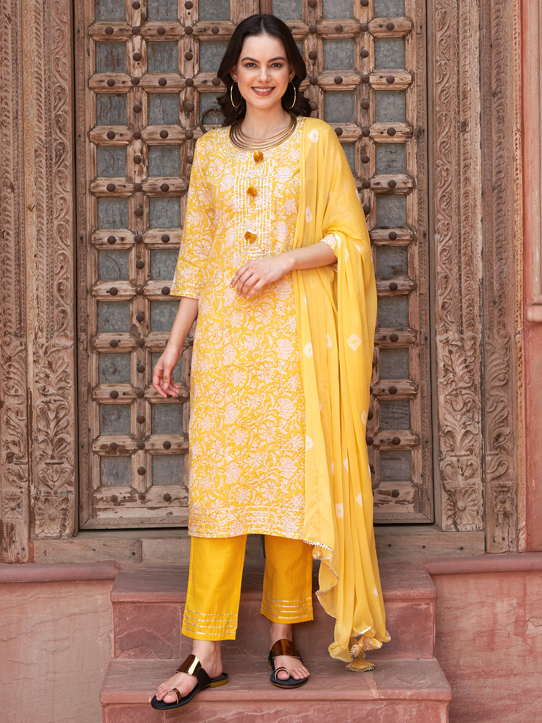 Brighten up any occasion with the Sunshine Bloom Floral Printed Kurta Set. Crafted from soft, breathable cotton fabric, this yellow ensemble features graceful floral prints, a comfortable straight-fit design, and a light, coordinated dupatta — perfect for festive events, casual outings, or summer wear.