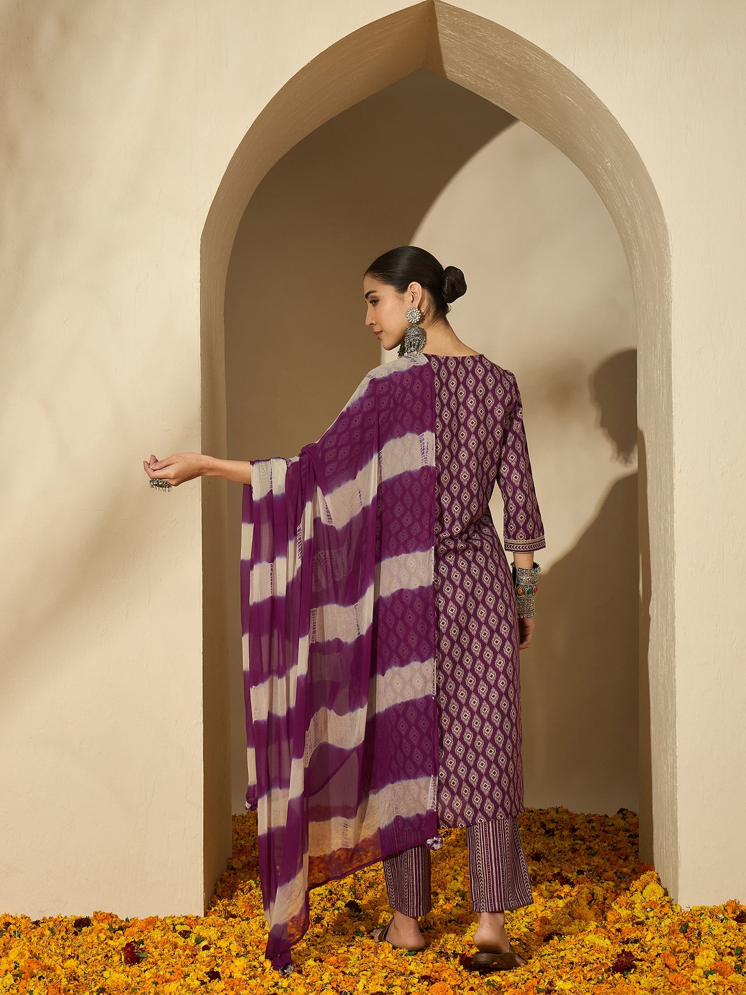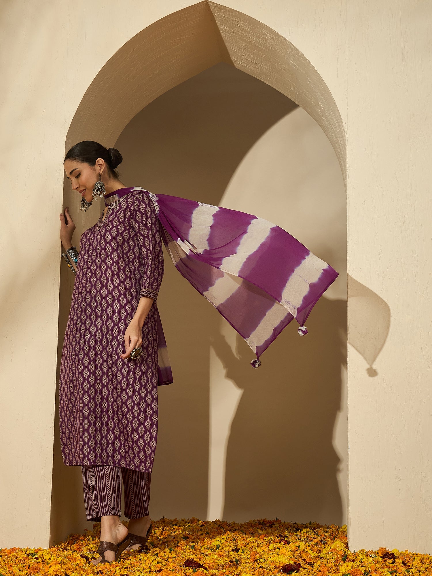 Mulberry Muse blends modern charm with ethnic flair — featuring a printed V-neck kurta in elegant purple and beige hues, paired with matching trousers and dupatta for a polished daytime ensemble.