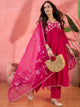 Pastel Vine is a gentle ode to femininity — featuring serene floral prints on a soft cotton A-line kurta with a mandarin collar. Coordinated with trouser and dupatta, it’s ideal for casual gatherings and festive charm.