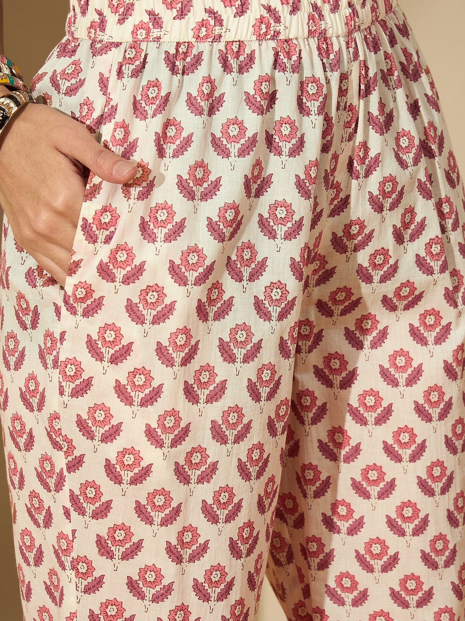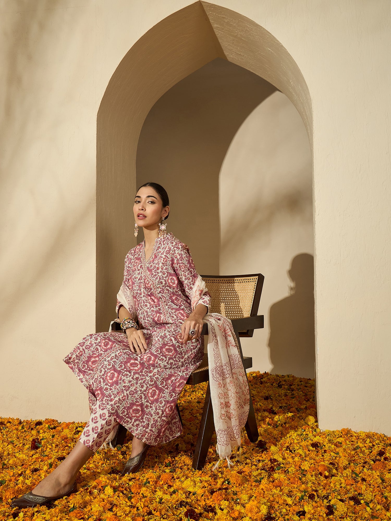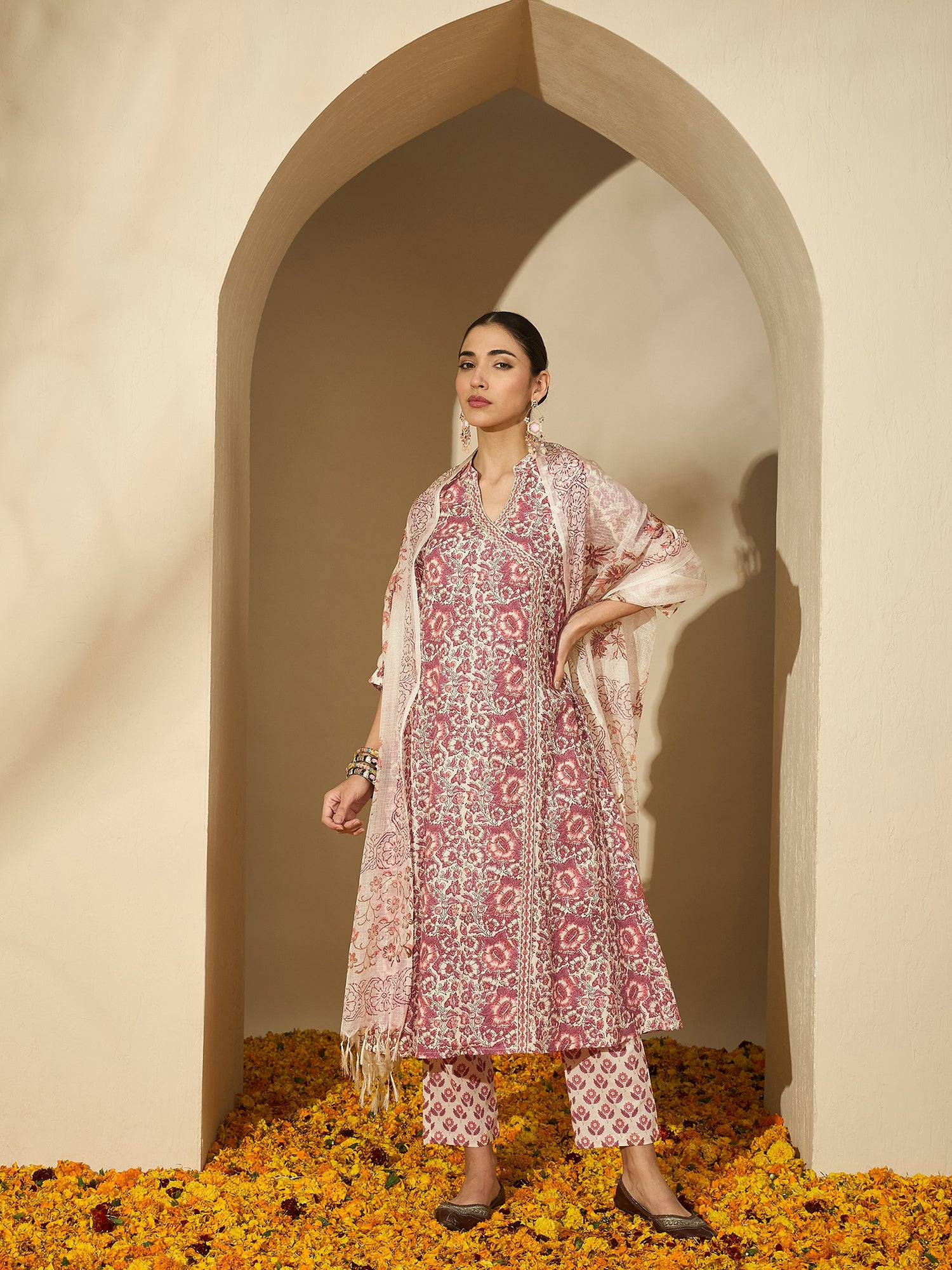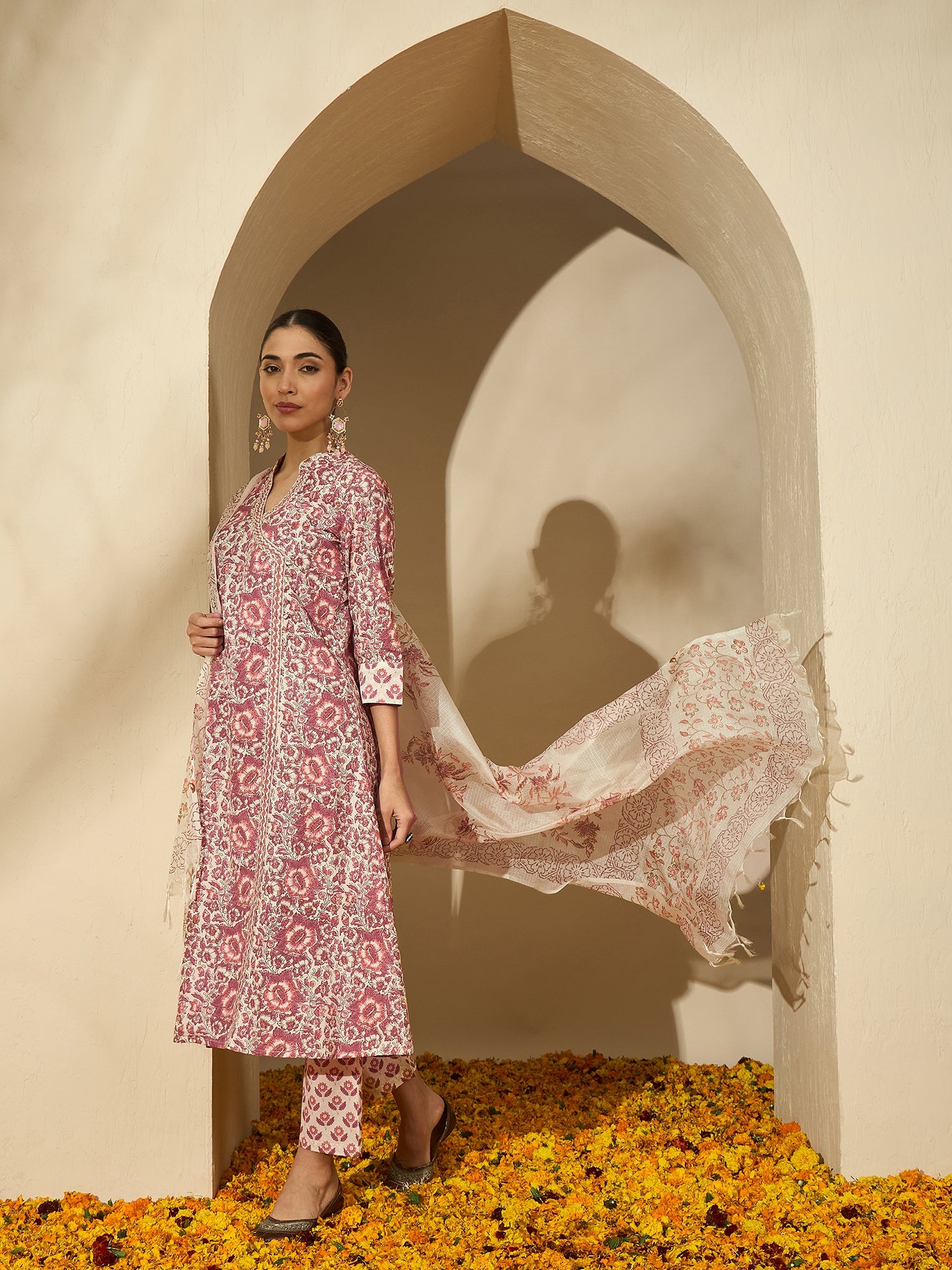 Pastel Vine Floral Printed A-Line Cotton Kurta with Trouser & Dupatta