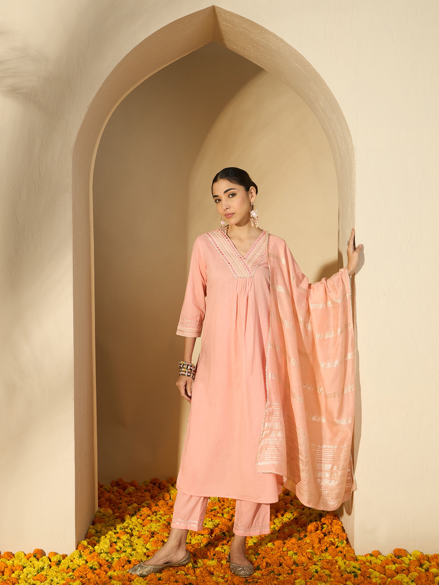 Peach Gleam Mirror Work Embroidered Cotton Kurta with Trousers & Dupatta