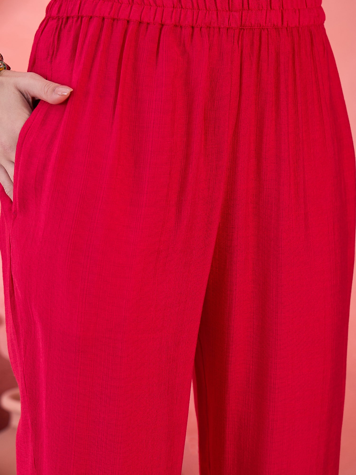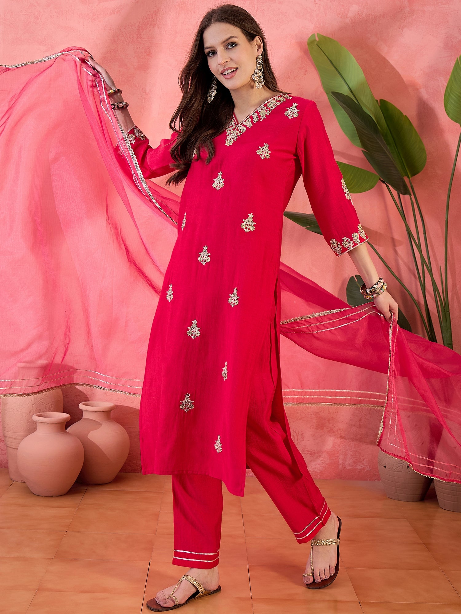 Ruby Mirage shimmers with festive finesse — a red straight kurta detailed with floral zari embroidery and a V-neckline. The matching trouser and dupatta complete this radiant, celebration-ready look.