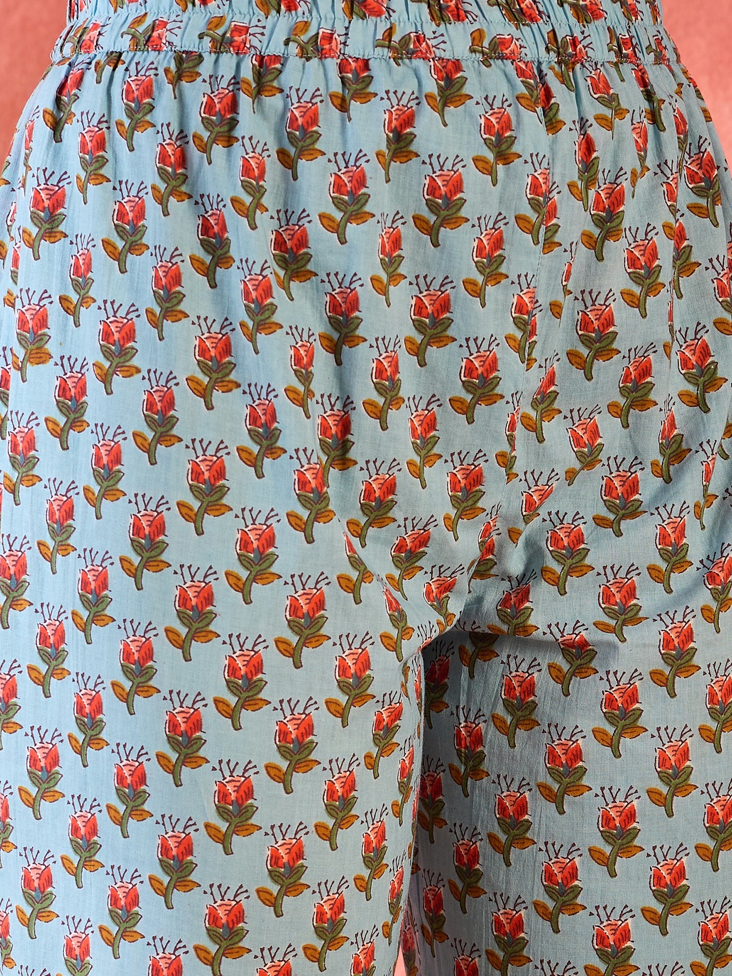 Sage Bloom Floral Printed & Embroidered Pure Cotton Anarkali Kurta with Trouser & Dupatta