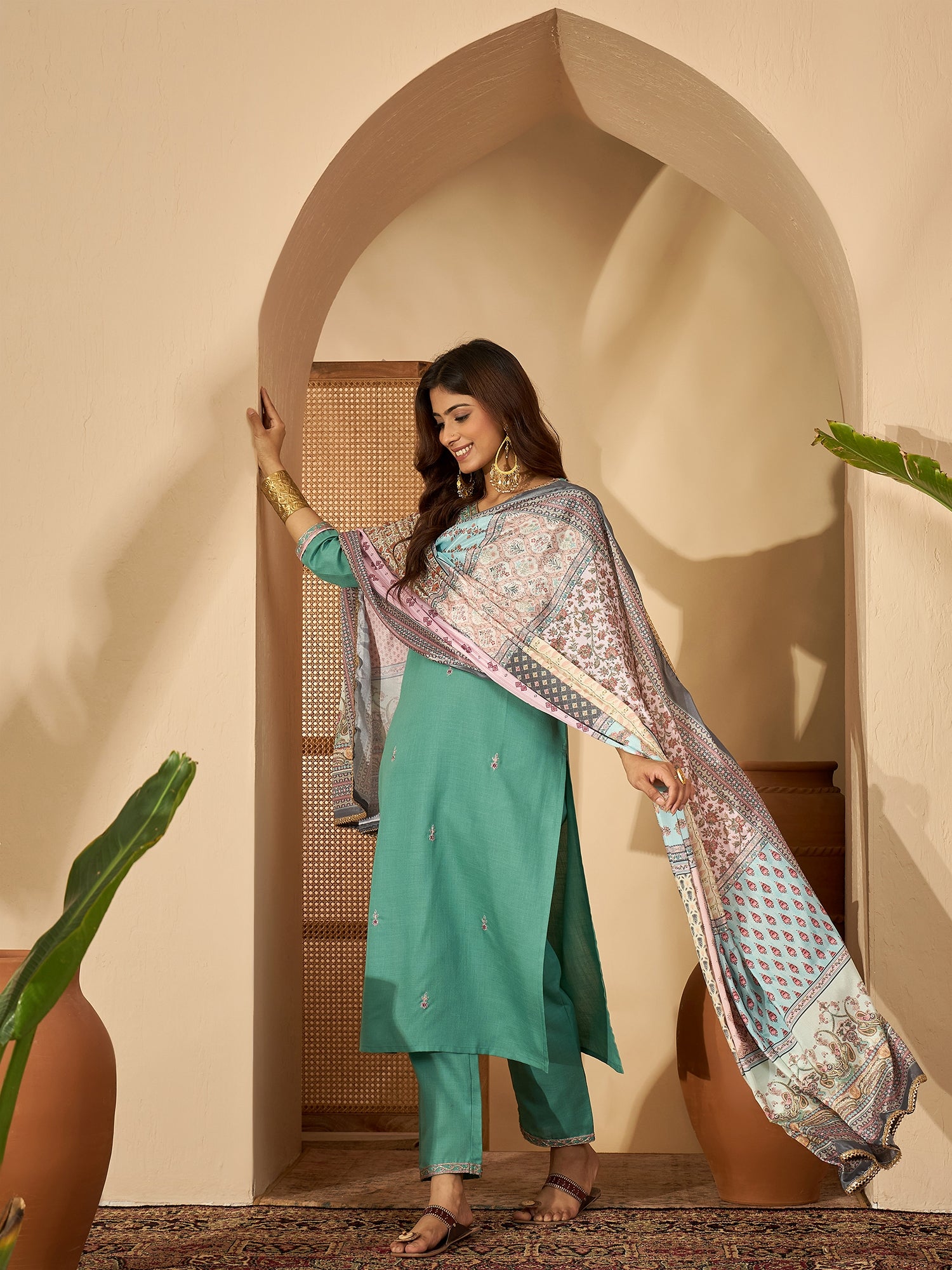 Seaside Glow reflects the calm elegance of ocean hues — a beautifully embroidered sea green kurta set in silk blend fabric, finished with a coordinated dupatta for a touch of festive radiance.