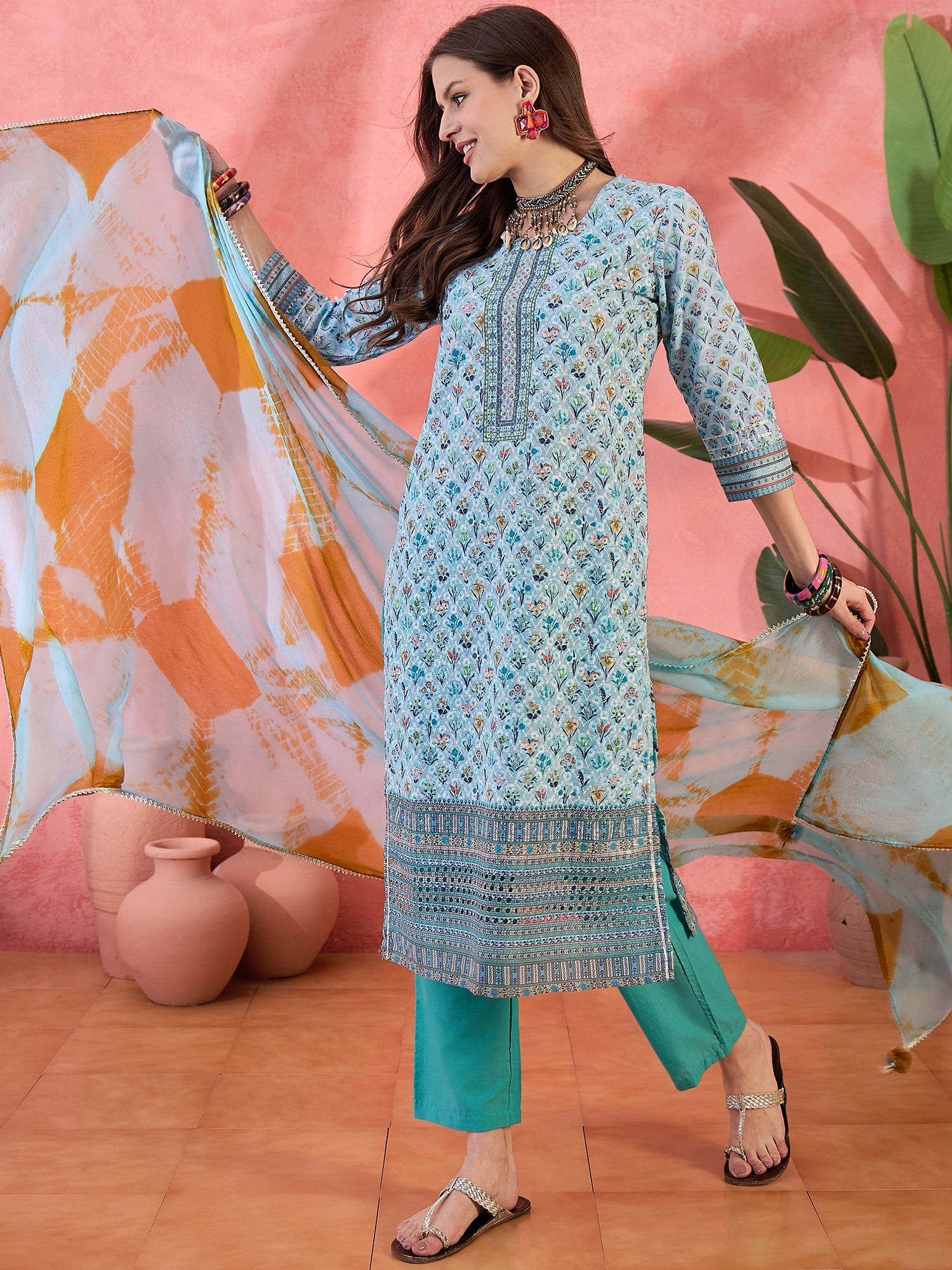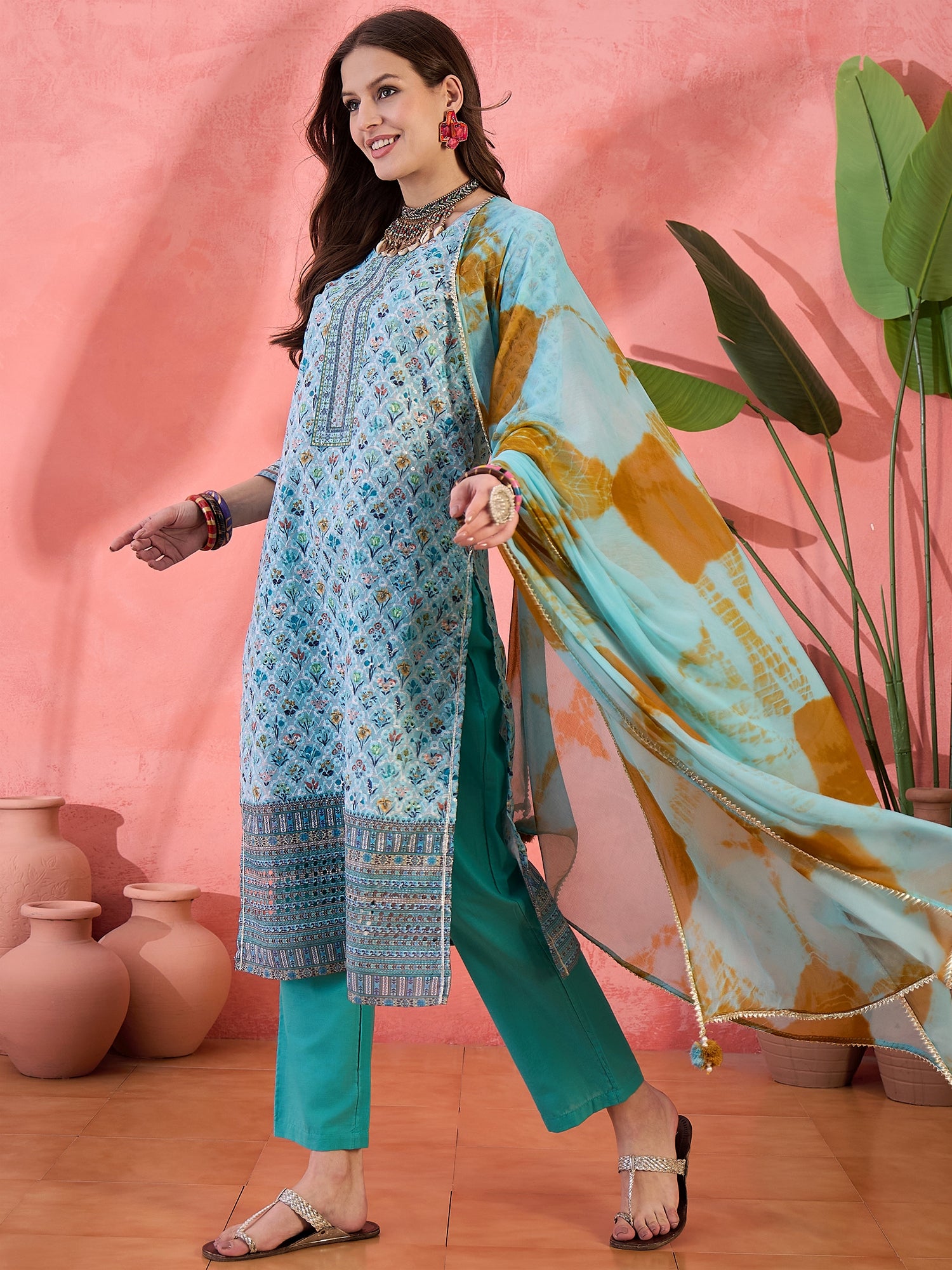 Skyline Bloom radiates soft elegance — blue floral prints on breathable cotton styled with a round neck and straight cut. The coordinating trouser and dupatta complete this serene and stylish ensemble.