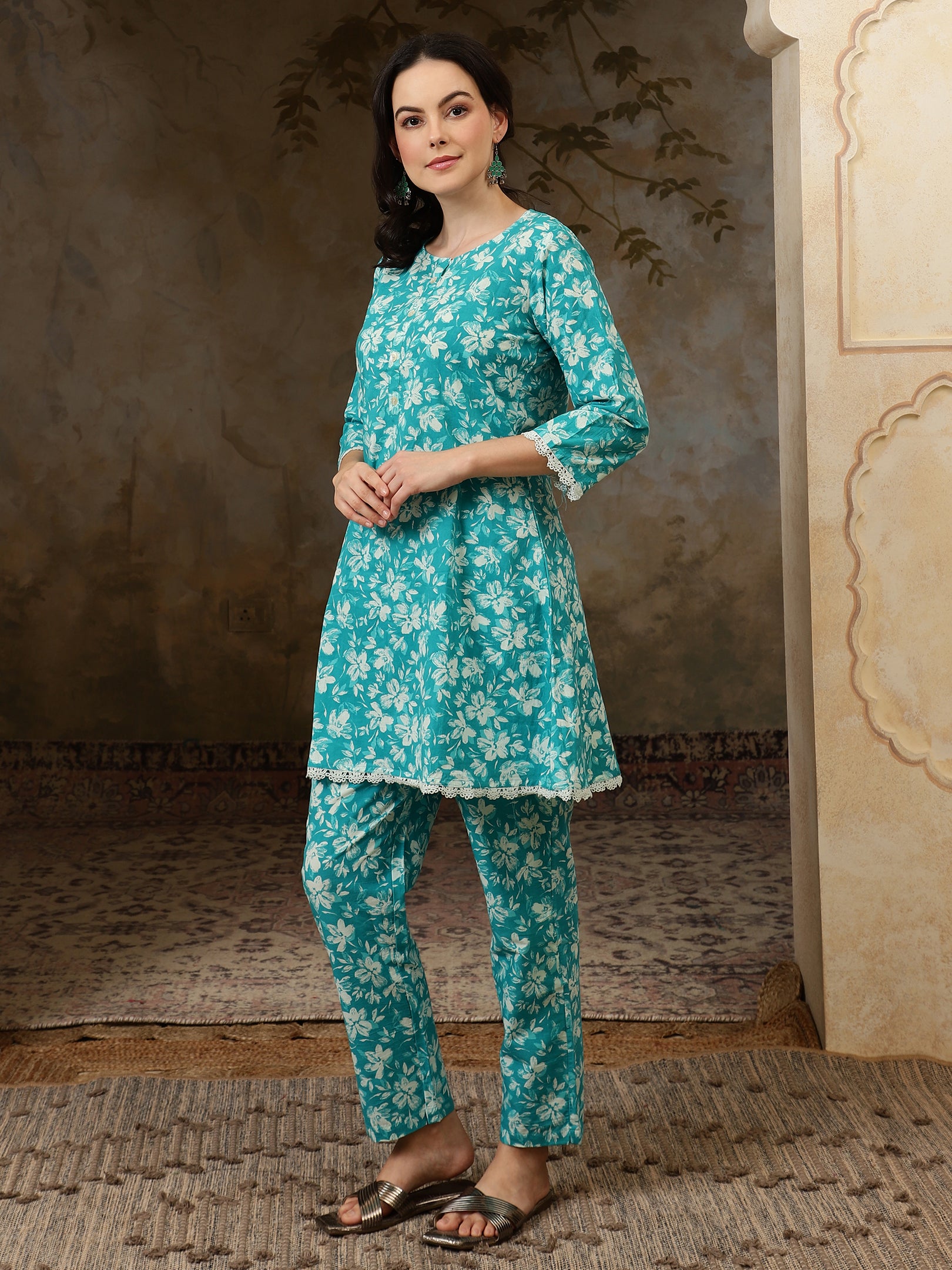 Aarini embodies serene sophistication — a pure cotton co-ord set in refreshing turquoise hues. The printed tunic paired with matching trousers exudes effortless grace, making it perfect for daytime outings, casual gatherings, or workwear elegance.
