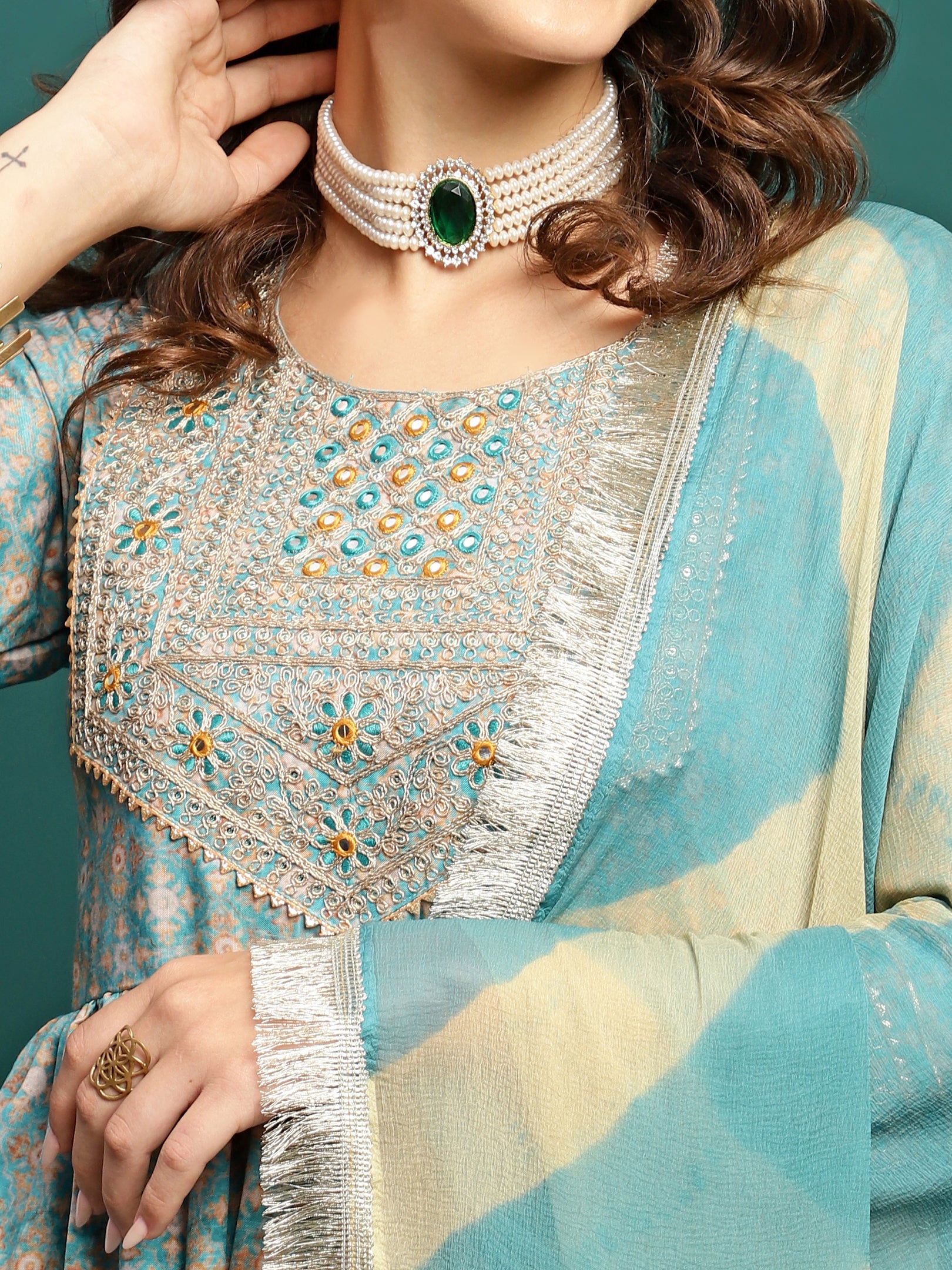 Gleam Garden Floral Printed Pleated Mirror Work A-Line Kurta With Trouser & Dupatta