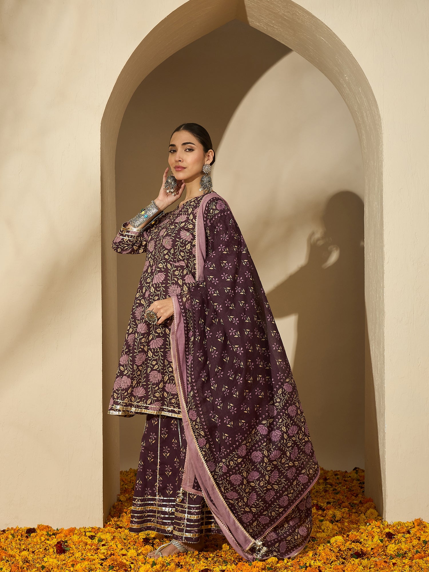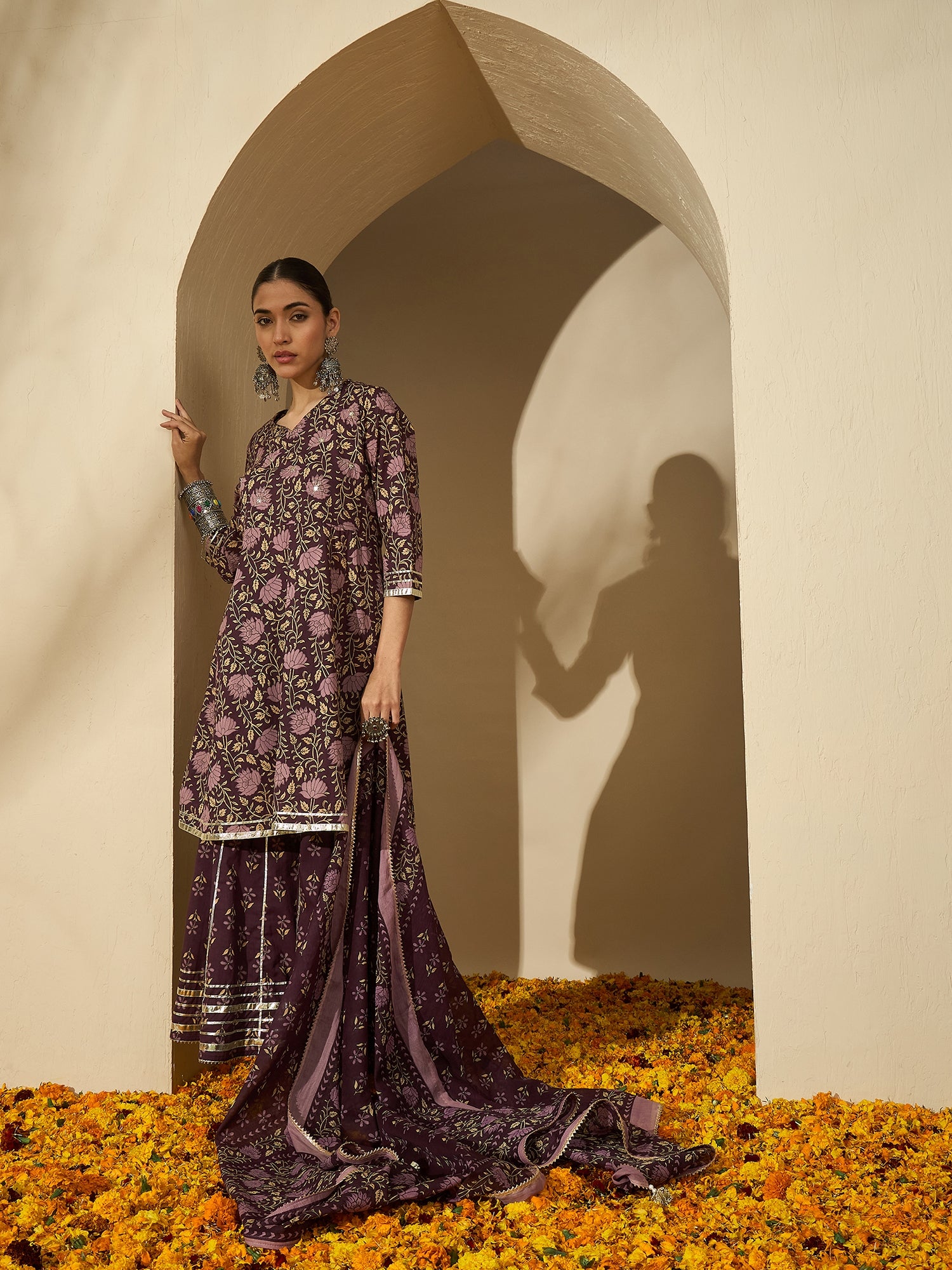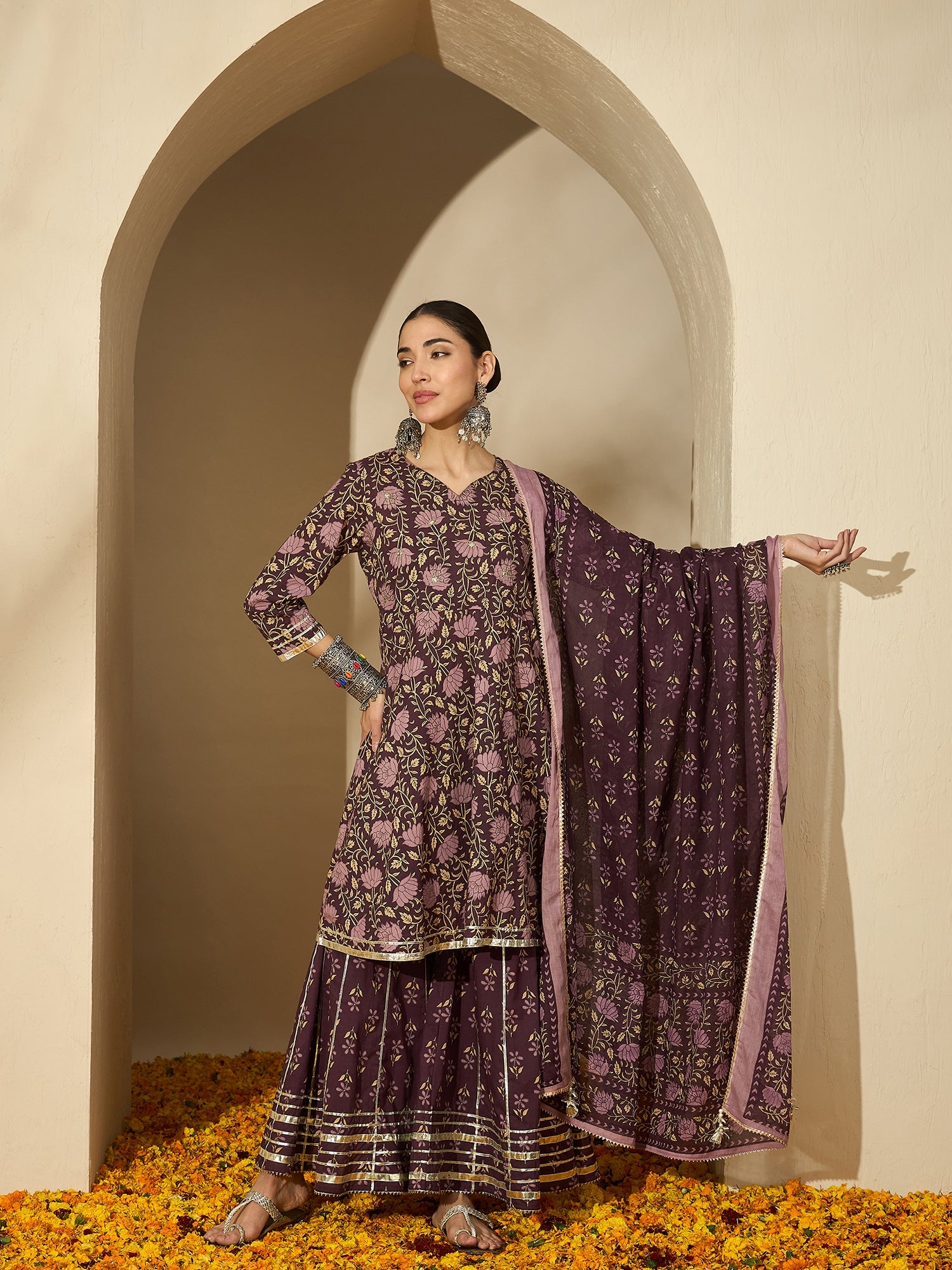 Iris Glow shines with feminine elegance — a pure cotton printed kurta in rich purple, styled with a classic sharara and dupatta. A beautiful blend of comfort and celebration for any occasion.