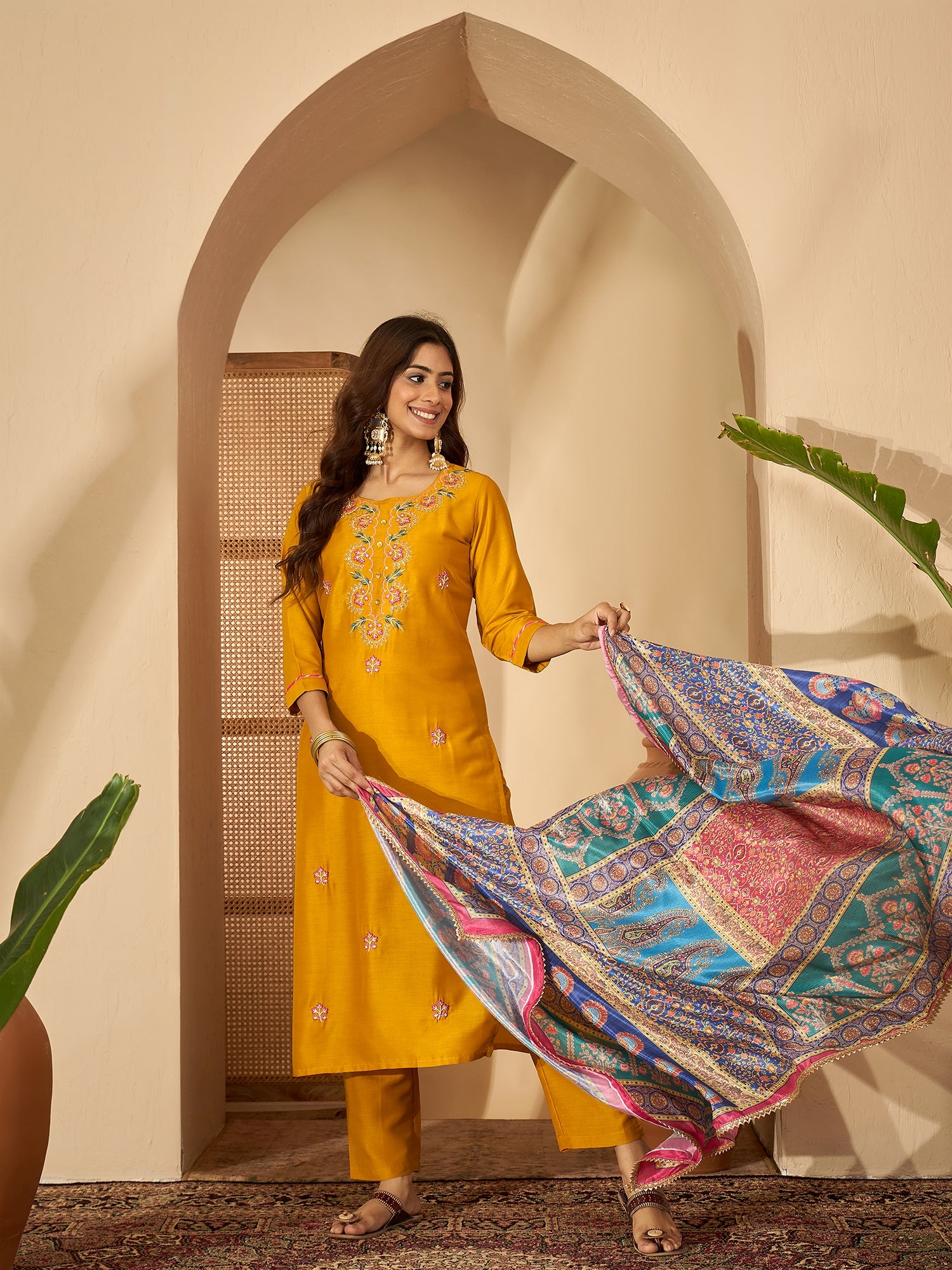 Marigold Muse blends tradition and shimmer — crafted from a rich silk blend in mustard tones, featuring elegant embroidery and sequin highlights. Paired with trousers and a dupatta for timeless festive allure.