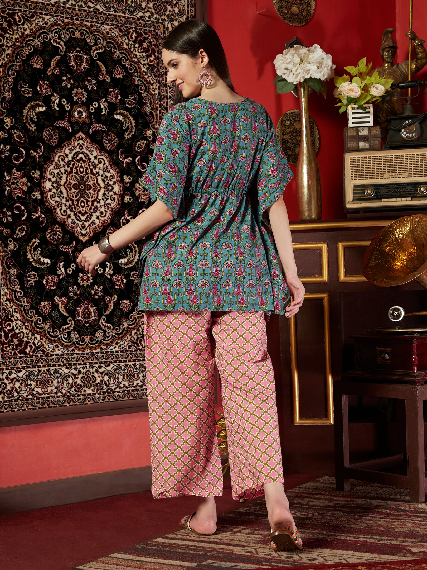 Embrace a wave of calm with the Pacific Petal Floral Printed Cotton Co-ord Set. Lightweight, breathable, and effortlessly chic — this blue ensemble is your perfect pick for brunches, beach strolls, or relaxed summer days.