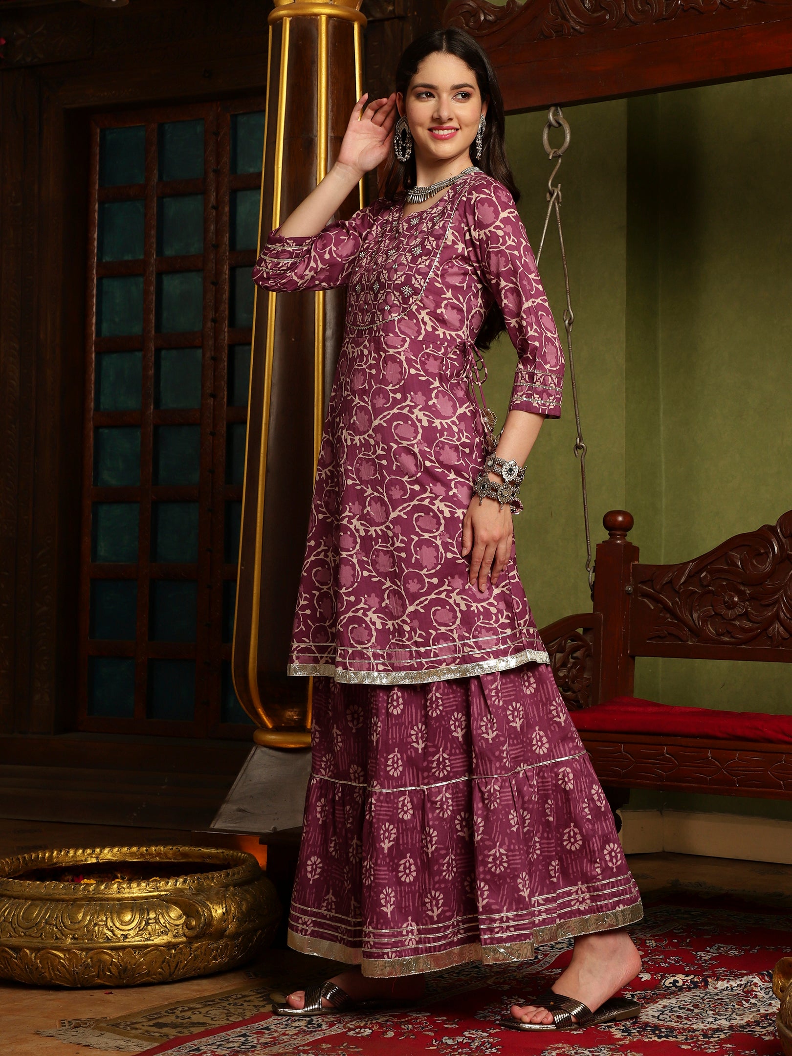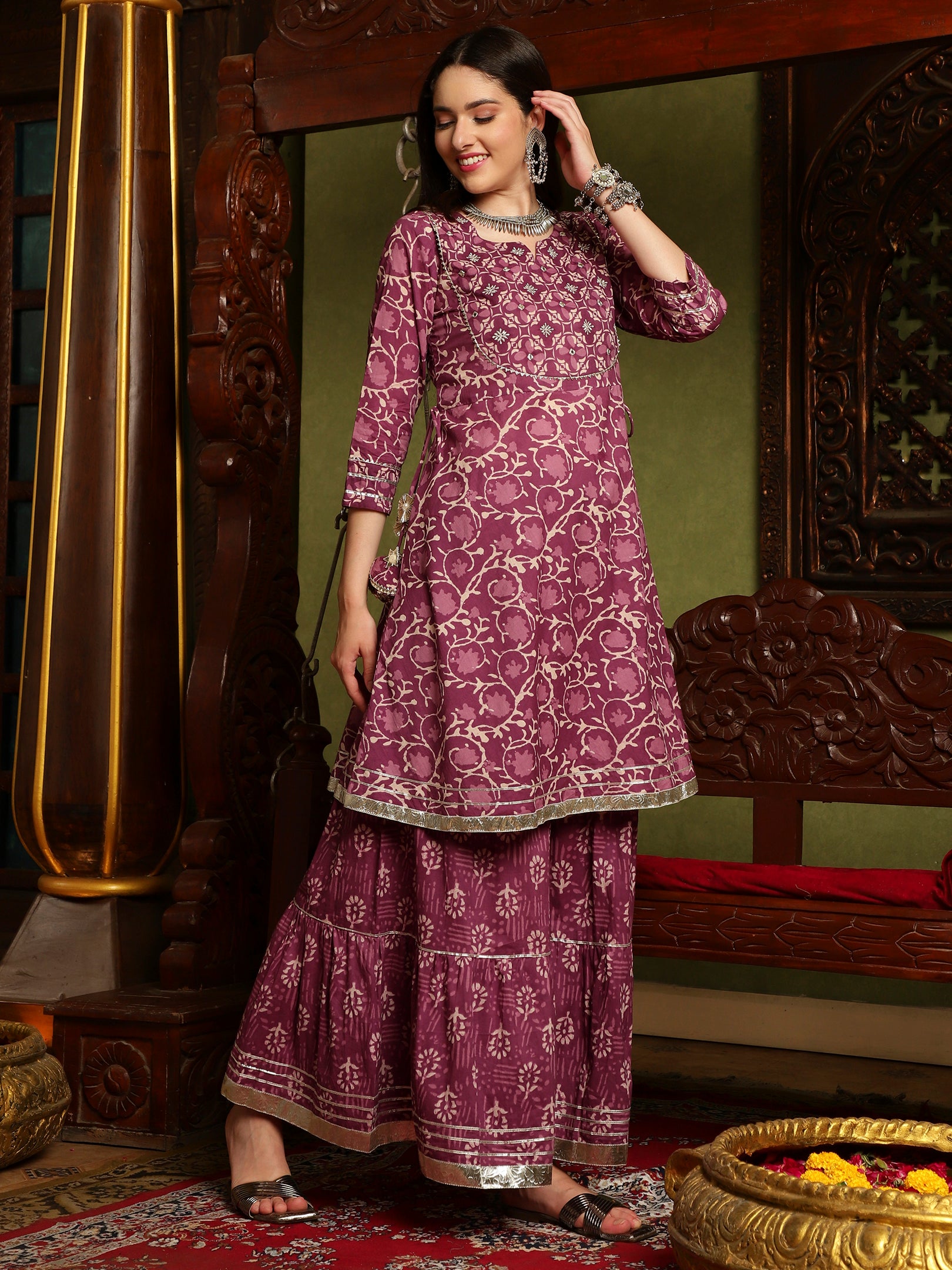 Step into timeless elegance with Royal Orchid, a rich purple kurta sharara set designed for the modern woman who loves traditional charm. Crafted in premium fabric with delicate detailing and a flowing silhouette, this outfit radiates regal grace and sophistication.