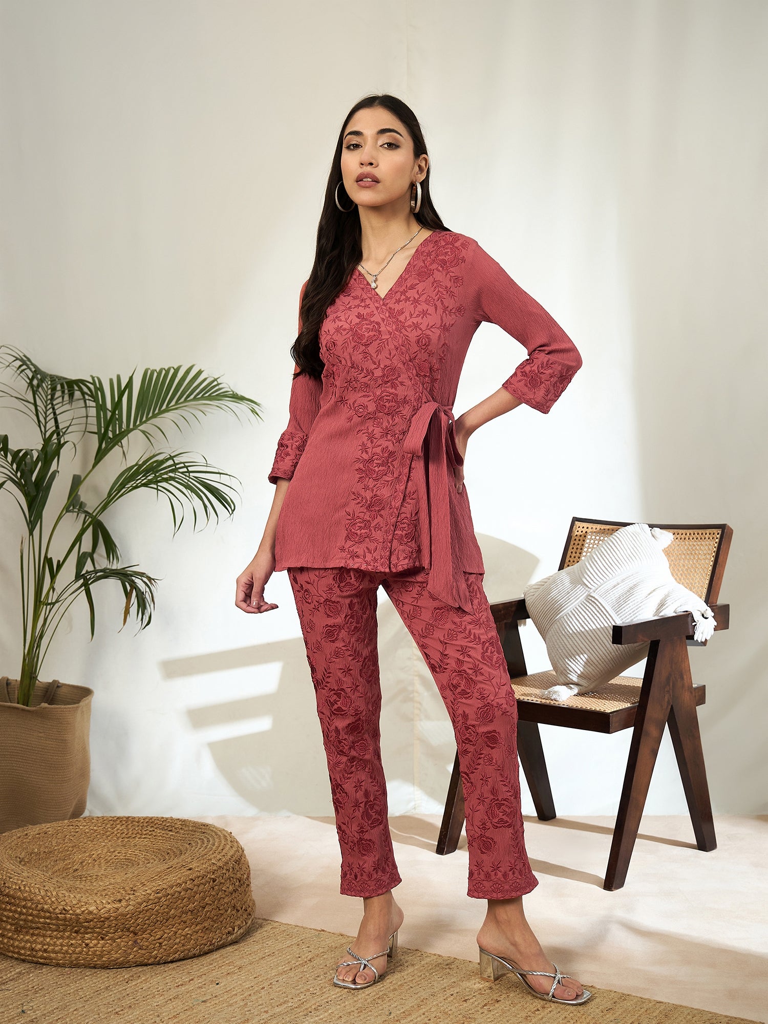 Ruhani exudes effortless grace with delicate floral embroidery on a V-neck tunic, paired with matching trousers. Crafted from soft, breathable fabric, this co-ord set blends timeless design with modern sophistication — perfect for festive or casual elegance.