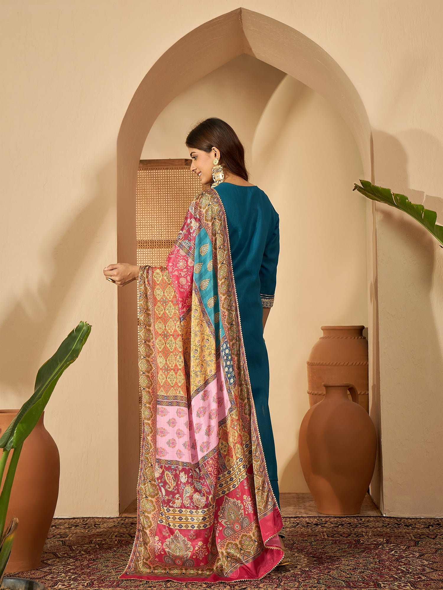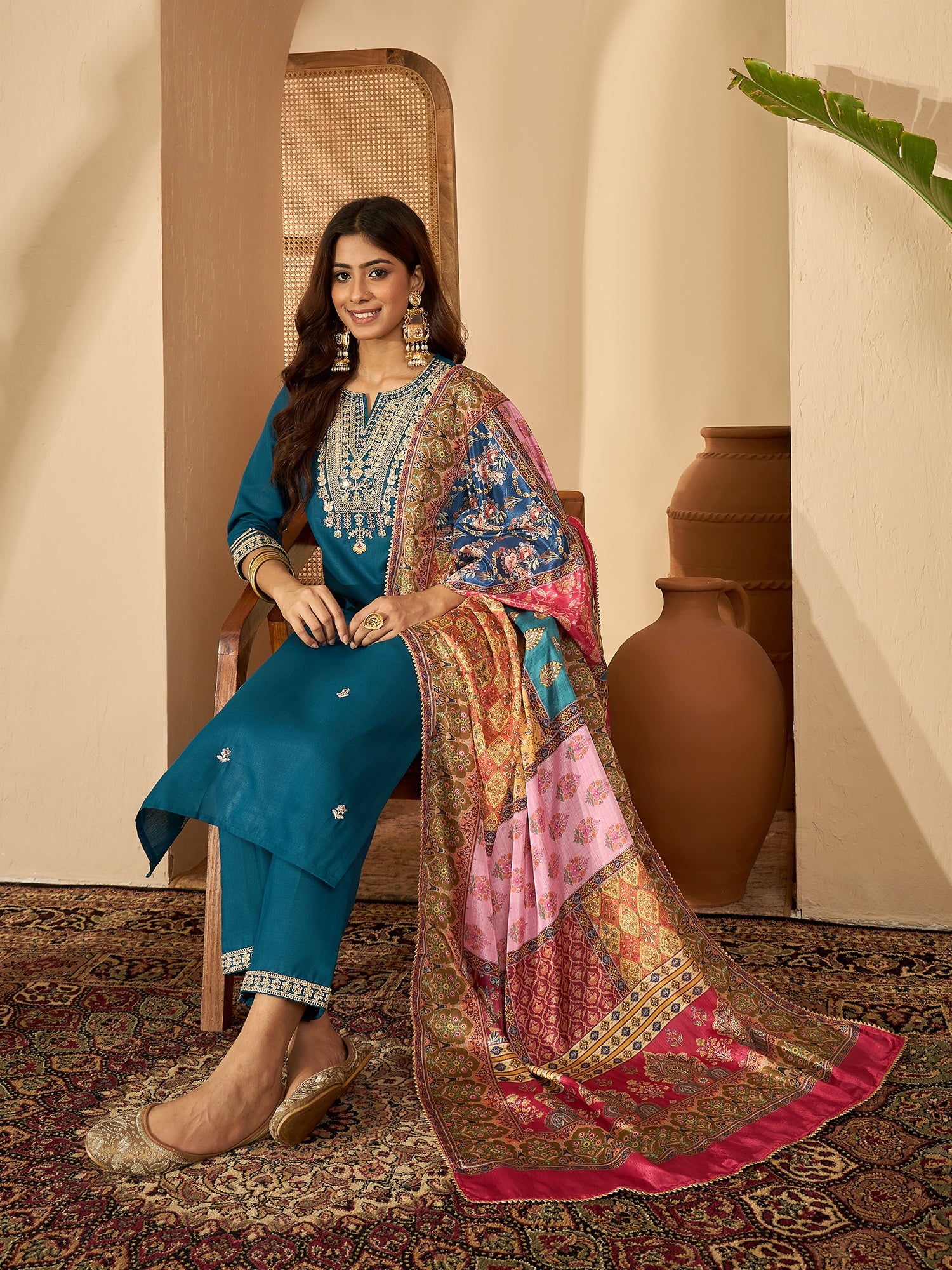 Teal Serenade sings of timeless grace — a silk blend kurta in soothing teal, detailed with delicate embroidery and paired with a flowing dupatta. A perfect choice for refined festive gatherings.