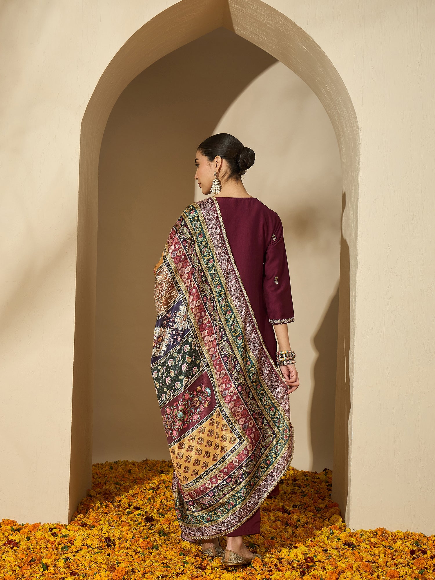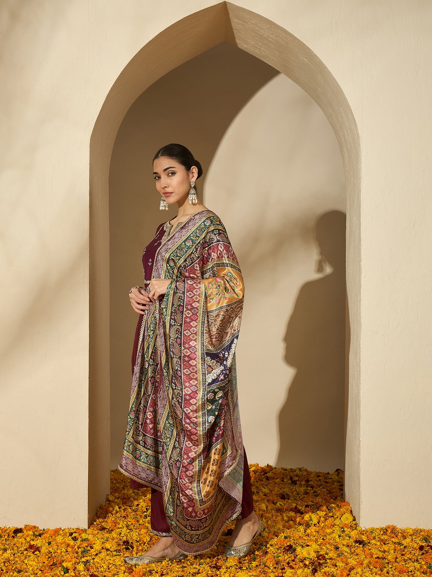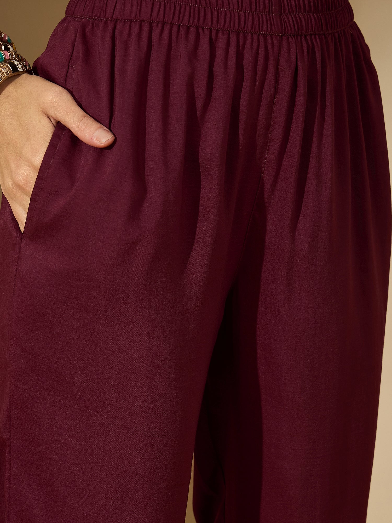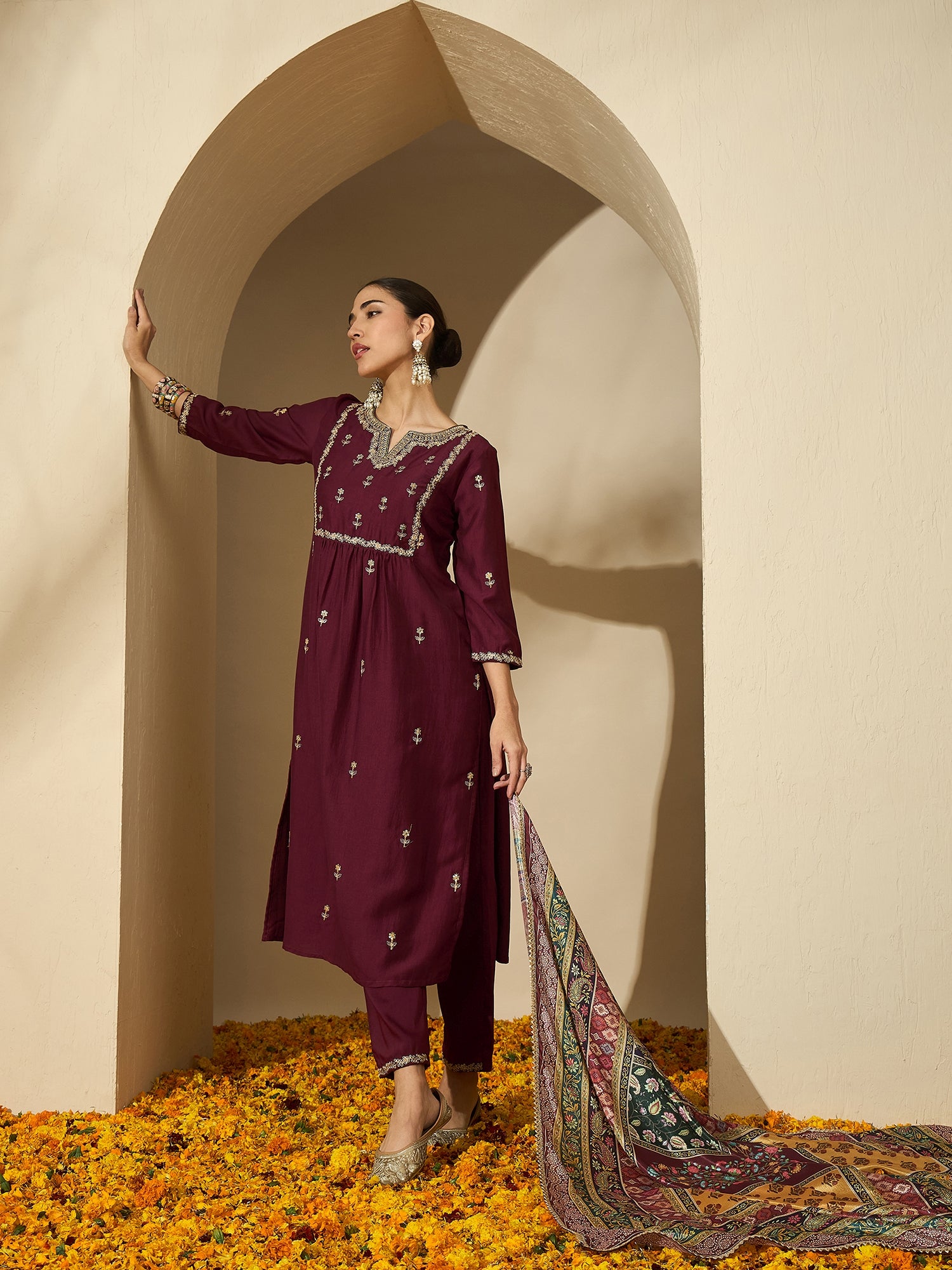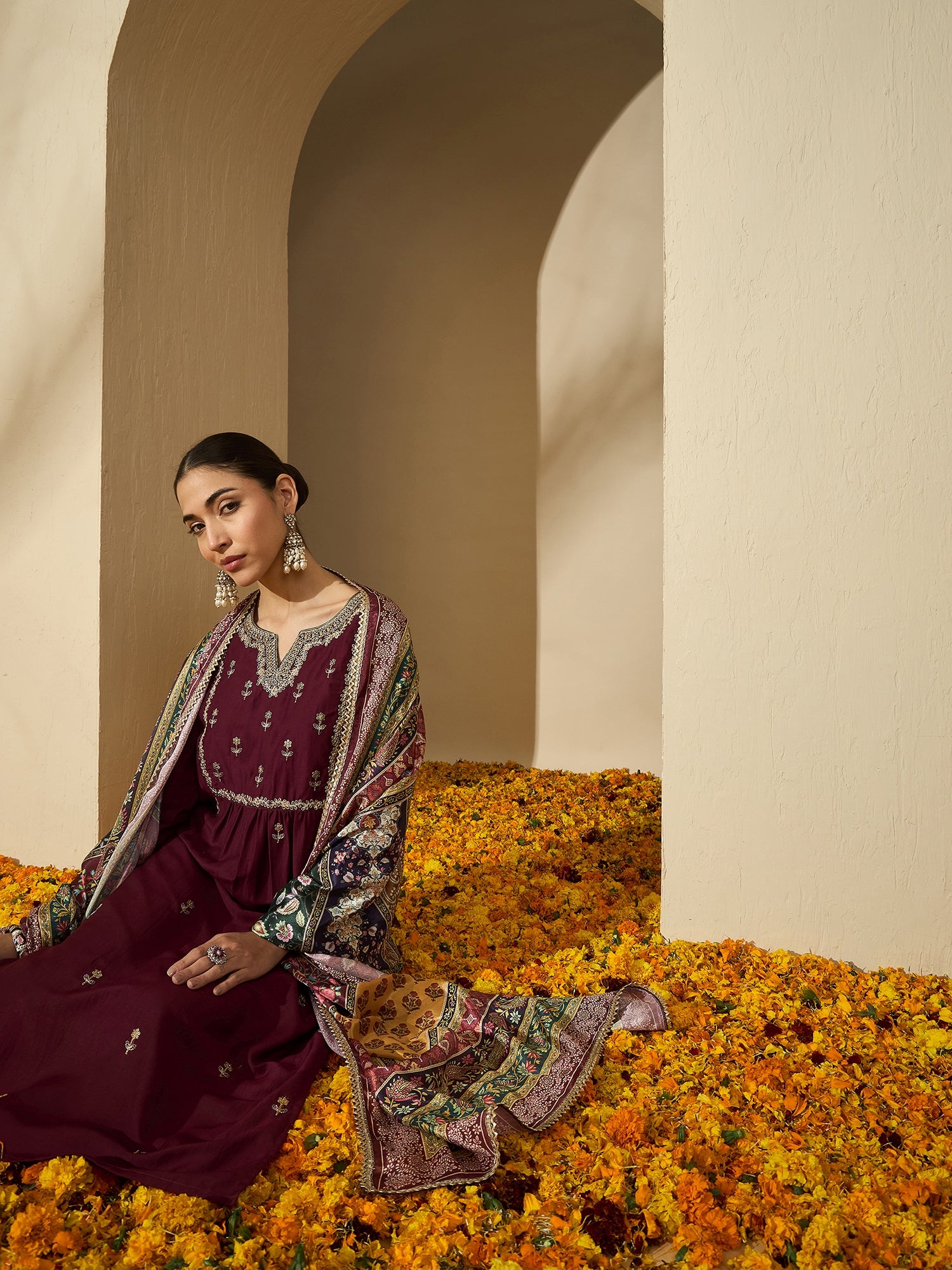 Wine Allure Maroon Embroidered Kurta with Trouser & Dupatta